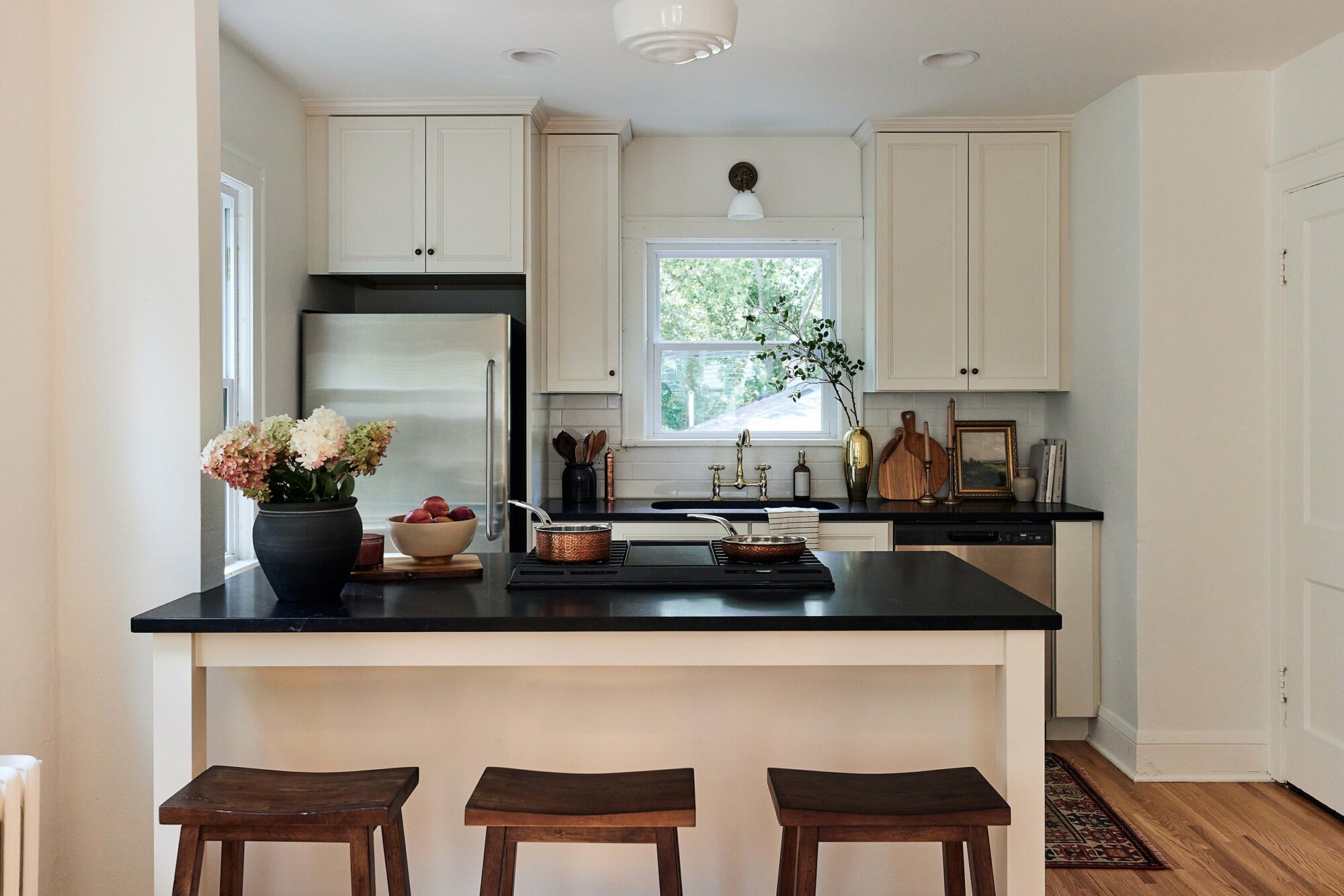 When I shared the reel on my IG, I had a few questions regarding not having a hood vent. Since this was the best layout, we had to place the stove in the island. In our experience, this hasnβt been an issue with our tenants. Worst case, the ceiling may have some residue from large amounts of smoke from cooking. If that happens, weβd just paint the ceiling.
