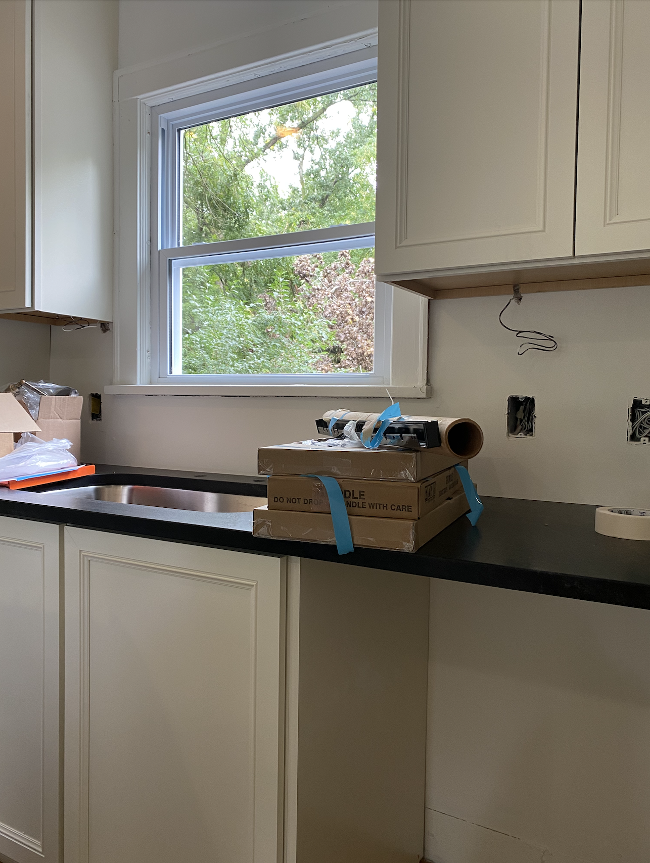 Then it was time to install new cream colored cabinets and black honed granite countertops! I love this combo and received affirmations of durability of honed granite from my readers.